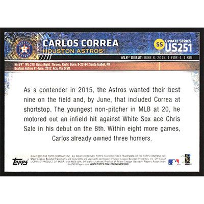This is a 2015 Topps Update Carlos Correa Rookie Debut baseball card. The card is #US251 and pictures show condition. Team(s): Houston Astros Rookie Card (RC)
