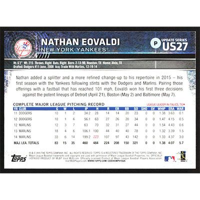 This is a 2015 Topps Update Nathan Eovaldi baseball card. The card is #US27 and pictures show condition.
