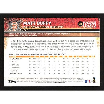 This is a 2015 Topps Update Matt Duffy Future Stars baseball card. The card is #US272 and pictures show condition. Team(s): San Francisco Giants Rookie Card (RC)