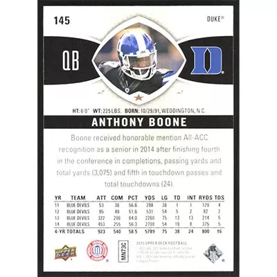 This is a 2015 Upper Deck Anthony Boone Star Rookie football card. The card is #145 and pictures show condition.