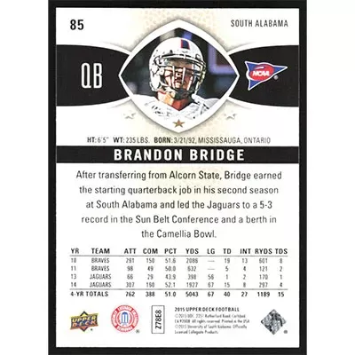 This is a 2015 Upper Deck Brandon Bridge Star Rookie football card. The card is #85 and pictures show condition. Team(s): South Alabama Jaguars Rookie Card (RC)