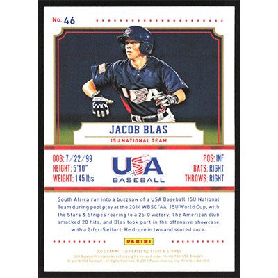 This is a 2015 USA Baseball Stars & Stripes Longevity Jacob Blas baseball card. The card is #46 and pictures show condition.