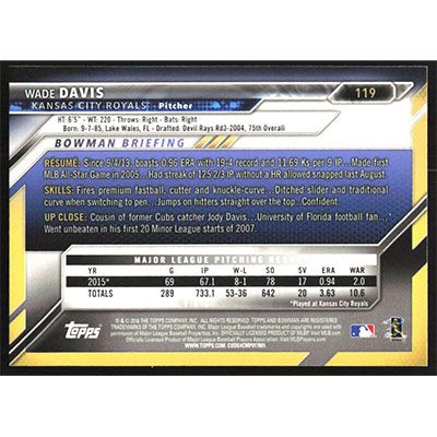 This is a 2016 Bowman Wade Davis baseball card. The card is #119 and pictures show condition.