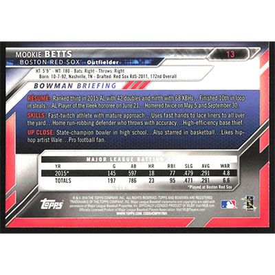 This is a 2016 Bowman Mookie Betts baseball card. The card is #13 and pictures show condition.