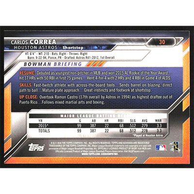 This is a 2016 Bowman Carlos Correa baseball card. The card is #30 and pictures show condition.