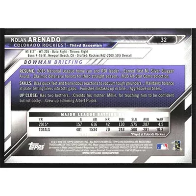 This is a 2016 Bowman Nolan Arenado baseball card. The card is #32 and pictures show condition.