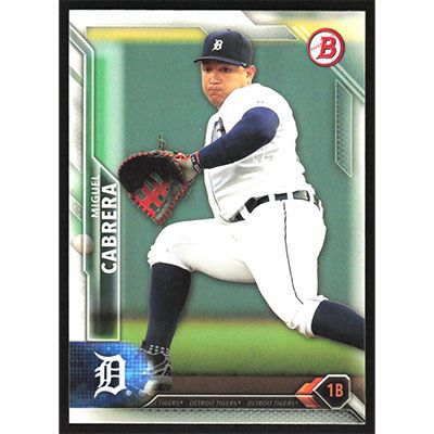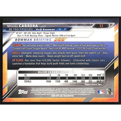 This is a 2016 Bowman Miguel Cabrera baseball card. The card is #33 and pictures show condition.