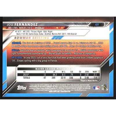 This is a 2016 Bowman Jose Fernandez baseball card. The card is #49 and pictures show condition.
