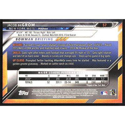 This is a 2016 Bowman Jacob deGrom baseball card. The card is #57 and pictures show condition.
