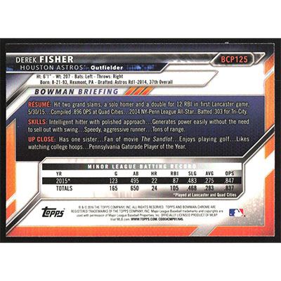 This is a 2016 Bowman Chrome Prospects Derek Fisher baseball card. The card is #BCP125 and pictures show condition.