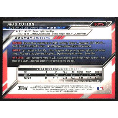 This is a 2016 Bowman Chrome Prospects Jharel Cotton baseball card. The card is #BCP26 and pictures show condition.