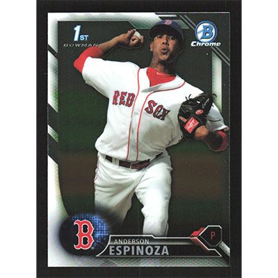 This is a 2016 Bowman Chrome Prospects Anderson Espinoza baseball card. The card is #BCP40 and pictures show condition.