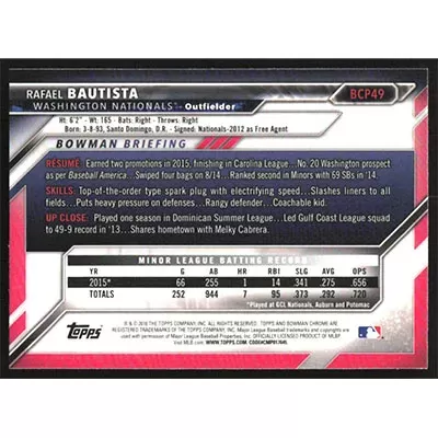 This is a 2016 Bowman Chrome Prospects Rafael Bautista baseball card. The card is #BCP49 and pictures show condition.