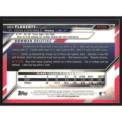This is a 2016 Bowman Chrome Prospects Jack Flaherty baseball card. The card is #BCP89 and pictures show condition.
