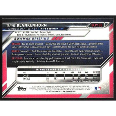This is a 2016 Bowman Chrome Prospects Black and Gold Refractors Travis Blankenhorn baseball card. The card is #BCP185 and pictures show condition. Team(s): Minnesota Twins