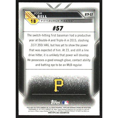 This is a 2016 Bowman Chrome Scouts Top 100 Josh Bell baseball card. The card is #BTP-57 and pictures show condition.