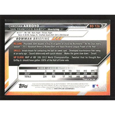 This is a 2016 Bowman Draft Christian Arroyo autographed baseball card. This card has been signed, in blue, by Christian Arroyo, and is guaranteed authentic by Ballcardz.com. The card is #BD-126 and pictures show condition.