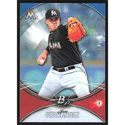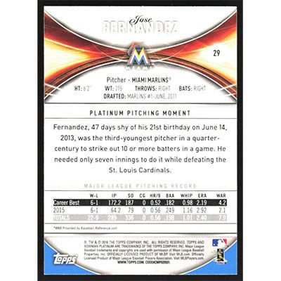 This is a 2016 Bowman Platinum Jose Fernandez baseball card. The card is #29 and pictures show condition.