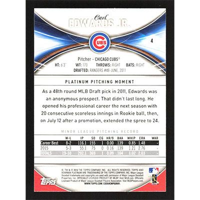 This is a 2016 Bowman Platinum Carl Edwards Jr. baseball card. The card is #4 and pictures show condition.