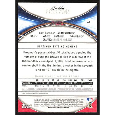 This is a 2016 Bowman Platinum Freddie Freeman baseball card. The card is #61 and pictures show condition.