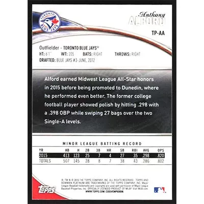 This is a 2016 Bowman Platinum Top Prospects Anthony Alford baseball card. The card is #TP-AA and pictures show condition.