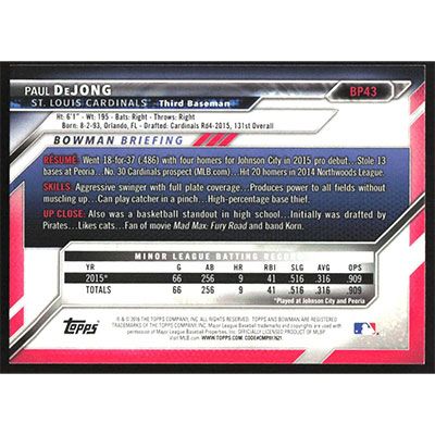 This is a 2016 Bowman Prospects Paul DeJong baseball card. The card is #BP43 and pictures show condition.