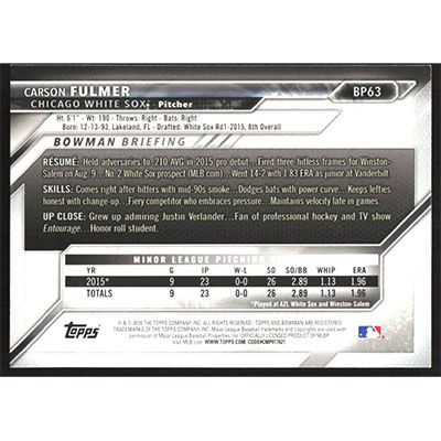 This is a 2016 Bowman Prospects Carson Fulmer baseball card. The card is #BP63 and pictures show condition.