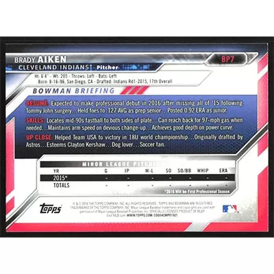This is a 2016 Bowman Prospects Brady Aiken baseball card. The card is #BP7 and pictures show condition.