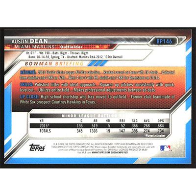 This is a 2016 Bowman Prospects Yellow Austin Dean baseball card. The card is #BP146 and pictures show condition.