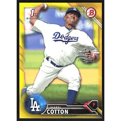 This is a 2016 Bowman Prospects Yellow Jharel Cotton baseball card. The card is #BP26 and pictures show condition.