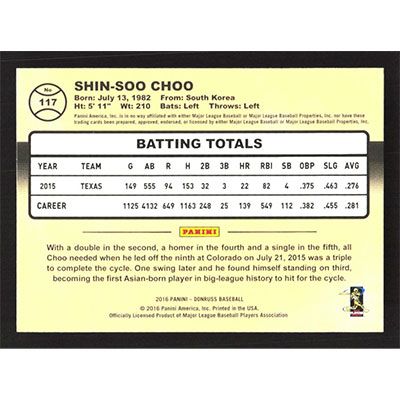 This is a 2016 Donruss Shin-Soo Choo baseball card. The card is #117 and pictures show condition.