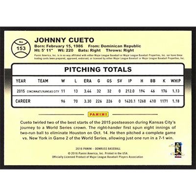 This is a 2016 Donruss Johnny Cueto baseball card. The card is #153 and pictures show condition.