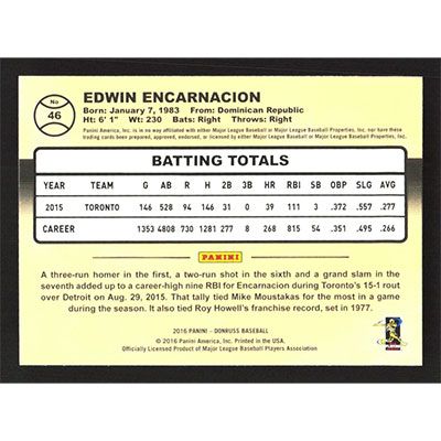 This is a 2016 Donruss Edwin Encarnacion baseball card. The card is #46 and pictures show condition.