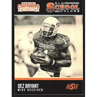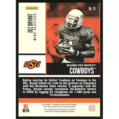 This is a 2016 Panini Contenders Draft Picks Old School Colors Dez Bryant football card. The card is #10 and pictures show condition. Team(s): Oklahoma State Cowboys