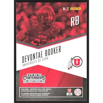 This is a 2016 Panini Contenders Draft Picks School Colors Devontae Booker football card. The card is #22 and pictures show condition.