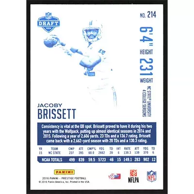 This is a 2016 Prestige Jacoby Brissett football card. The card is #214 and pictures show condition.