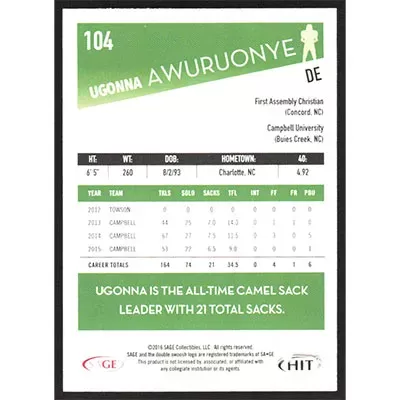 This is a 2016 SAGE HIT Ugonna Awuruonye football card. The card is #104 and pictures show condition.