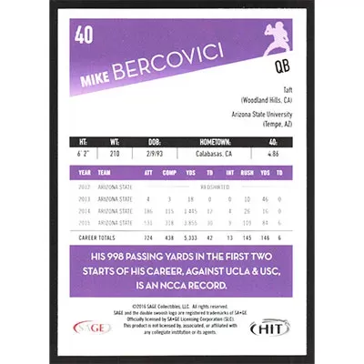 This is a 2016 SAGE HIT Mike Bercovici football card. The card is #40 and pictures show condition.