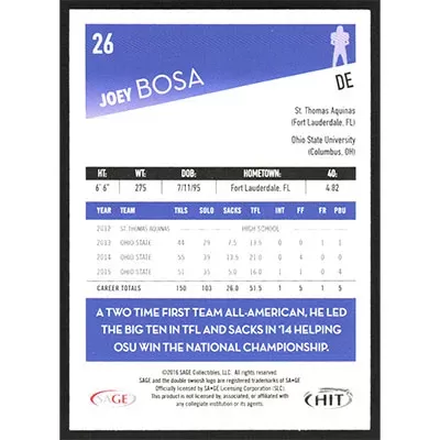 This is a 2016 SAGE HIT Silver Joey Bosa football card. The card is #26 and pictures show condition.