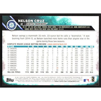 This is a 2016 Topps Nelson Cruz autographed baseball card. This card has been signed, in blue, by Nelson Cruz, and is guaranteed authentic by Ballcardz.com. The card is #10 and pictures show condition.
