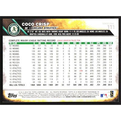 This is a 2016 Topps Coco Crisp baseball card. The card is #111 and pictures show condition.