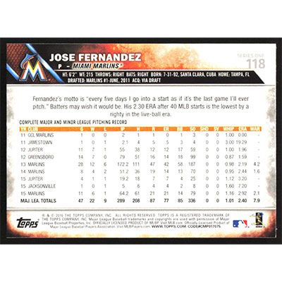 This is a 2016 Topps Jose Fernandez baseball card. The card is #118 and pictures show condition.