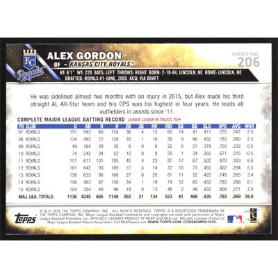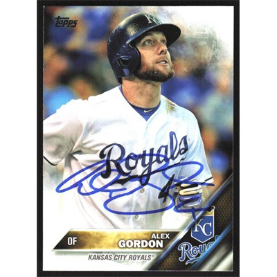 This is a 2016 Topps Alex Gordon autographed baseball card. This card has been signed, in blue, by Alex Gordon, and is guaranteed authentic by Ballcardz.com. The card is #206 and pictures show condition.