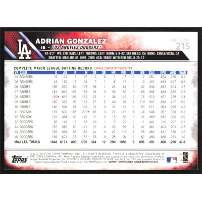 This is a 2016 Topps Adrian Gonzalez baseball card. The card is #215 and pictures show condition.