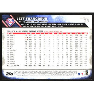 This is a 2016 Topps Jeff Francoeur autographed baseball card. This card has been signed, in blue, by Jeff Francoeur, and is guaranteed authentic by Ballcardz.com. The card is #23 and pictures show condition.