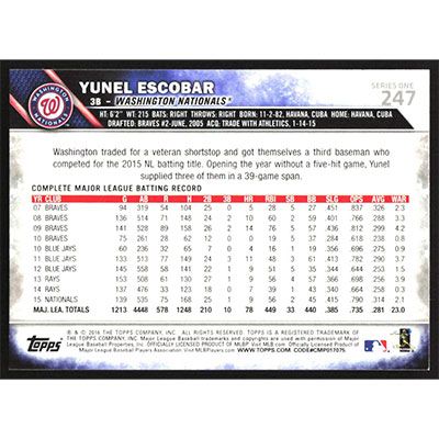 This is a 2016 Topps Yunel Escobar baseball card. The card is #247 and pictures show condition.