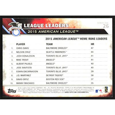 This is a 2016 Topps Chris Davis, Nelson Cruz and Mike Trout League Leaders baseball card. The card is #26 and pictures show condition. Team(s): Baltimore Orioles/Seattle Mariners/Los Angeles Angels