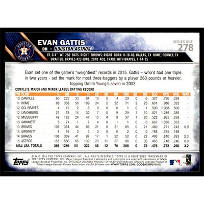 This is a 2016 Topps Evan Gattis baseball card. The card is #278 and pictures show condition.
