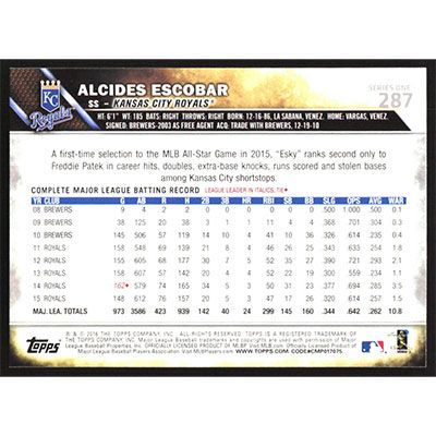 This is a 2016 Topps Alcides Escobar baseball card. The card is #287 and pictures show condition.