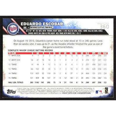 This is a 2016 Topps Eduardo Escobar baseball card. The card is #360 and pictures show condition.
